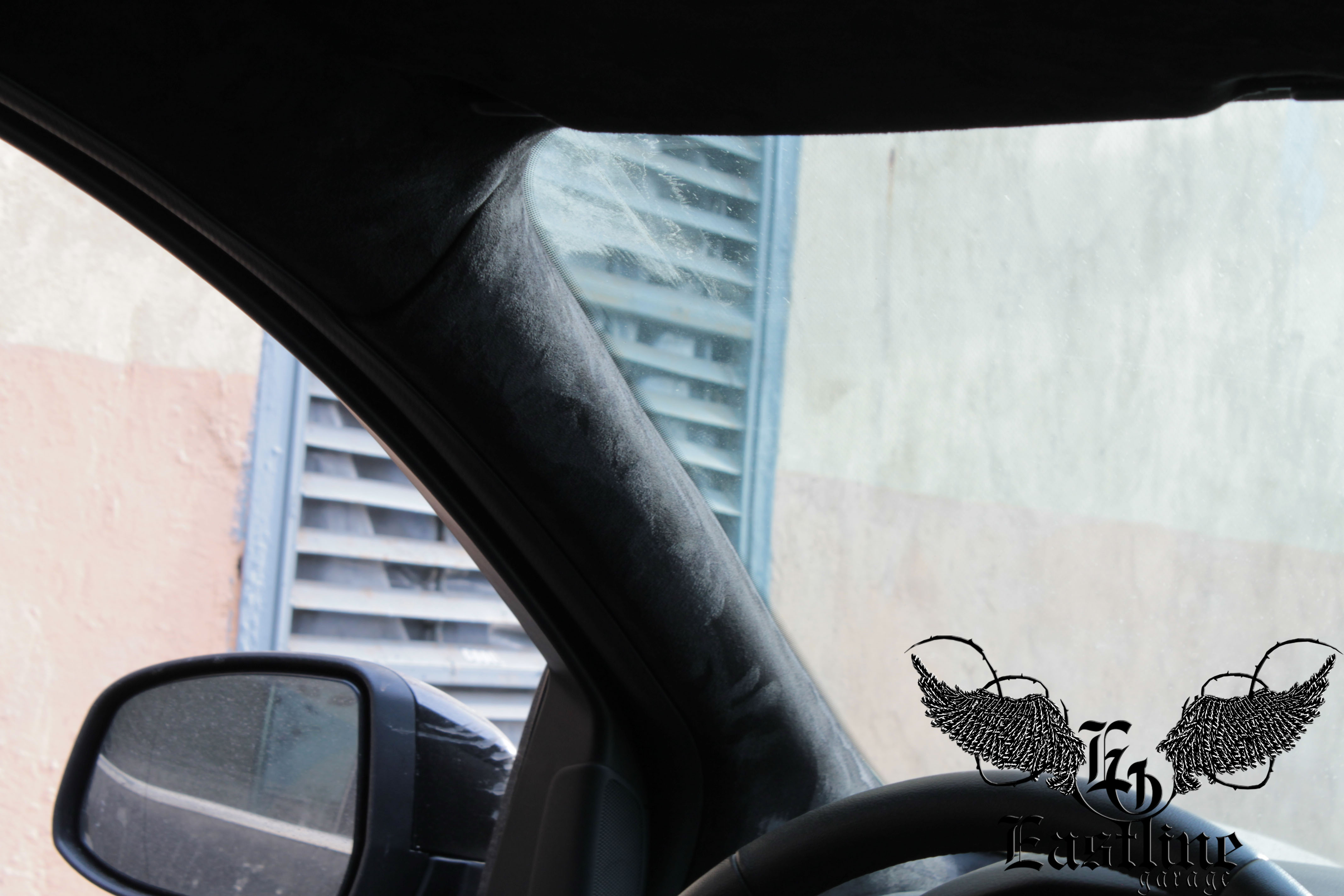 Помимо самого потолка, в черный самоклеющийся аналог алькантары мы перетянули все стойки и солнцезащитные козырьки.