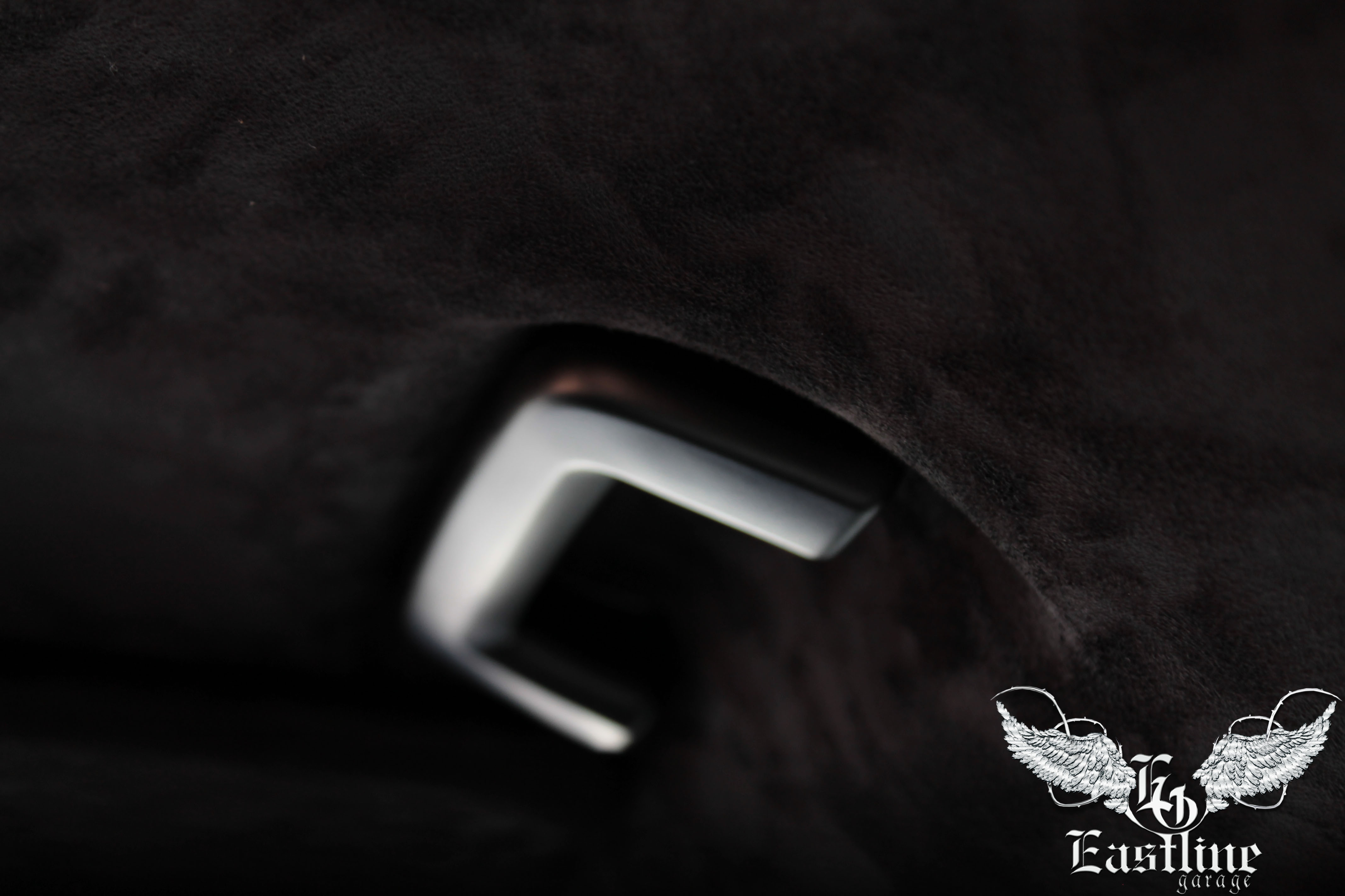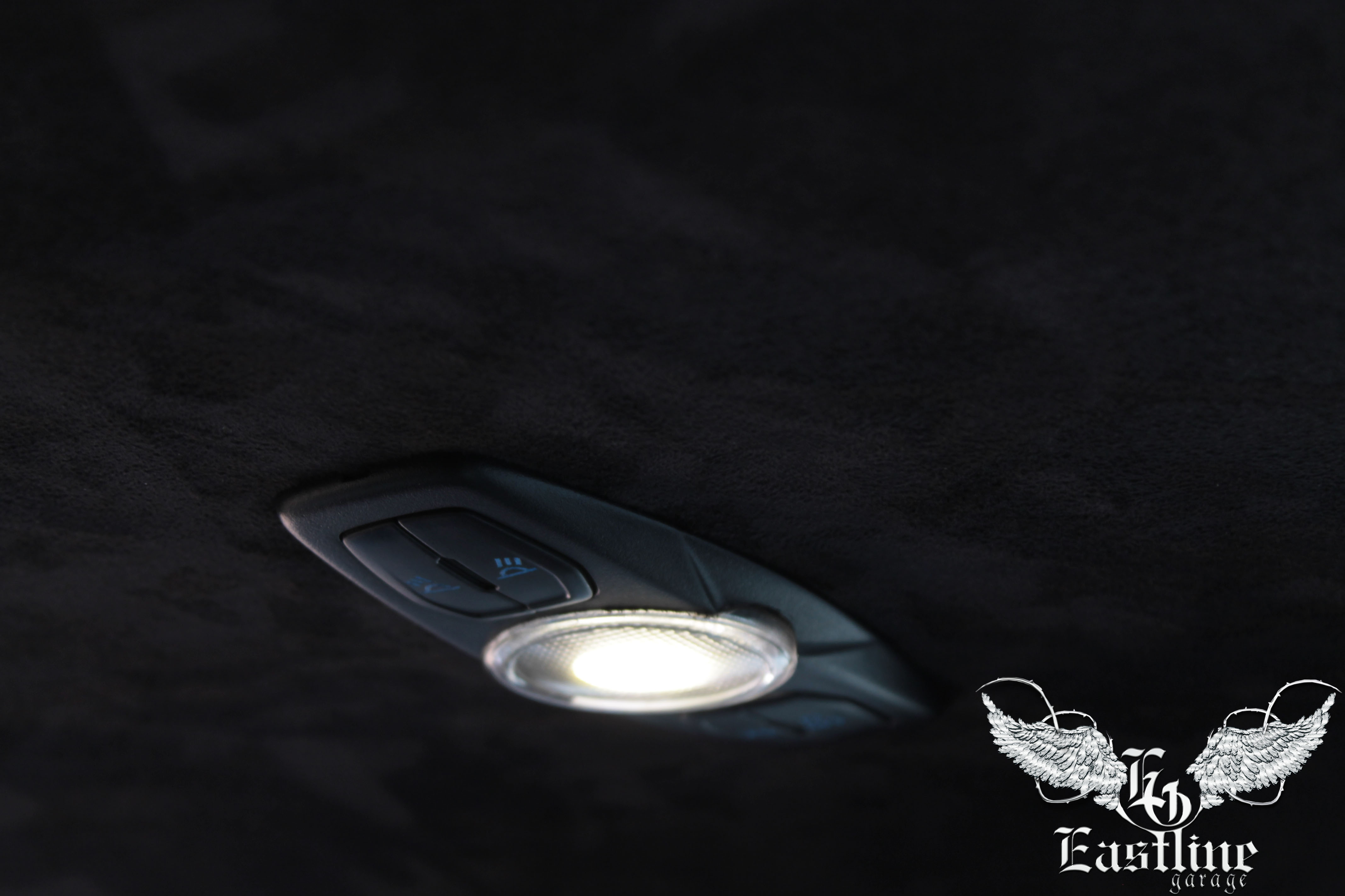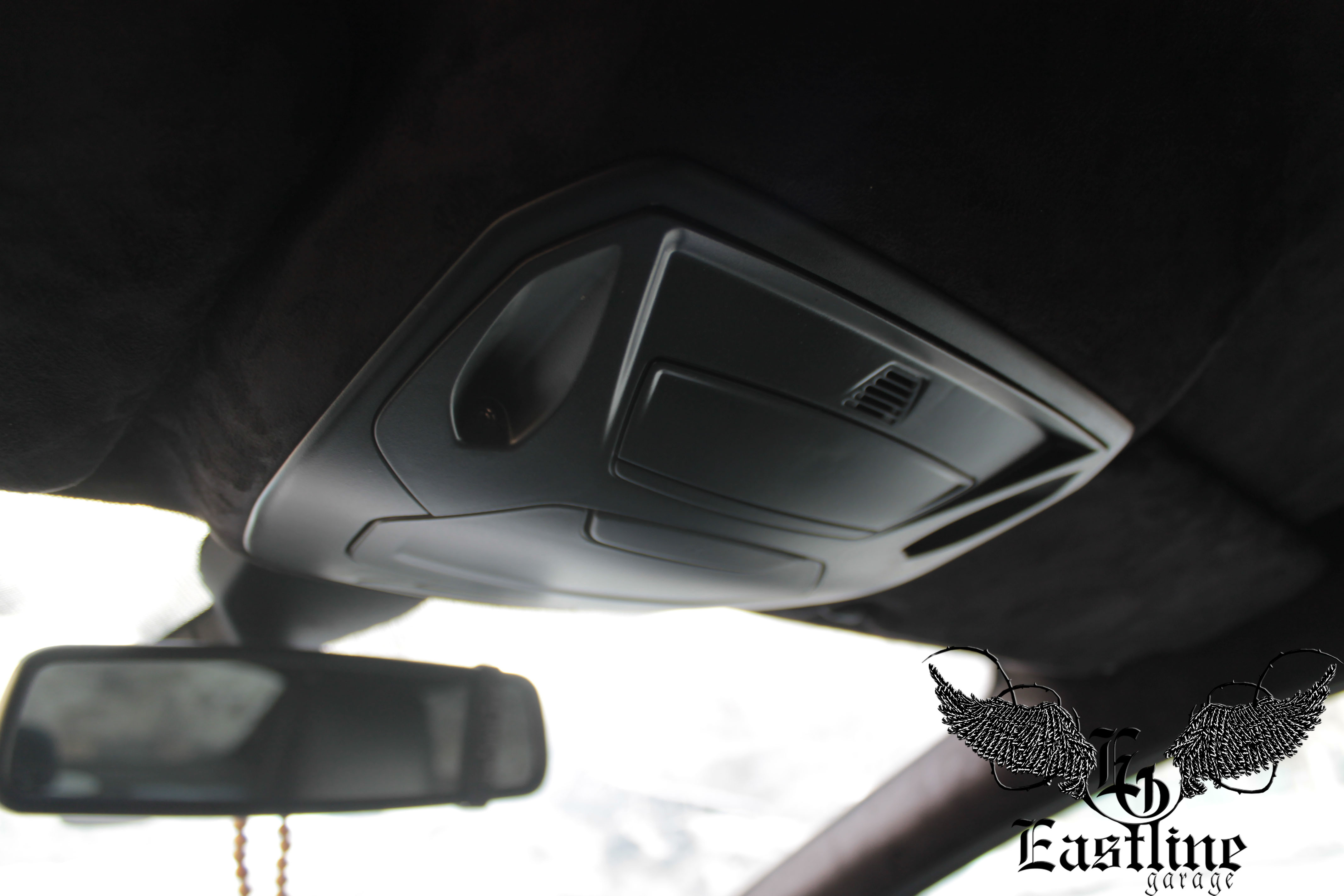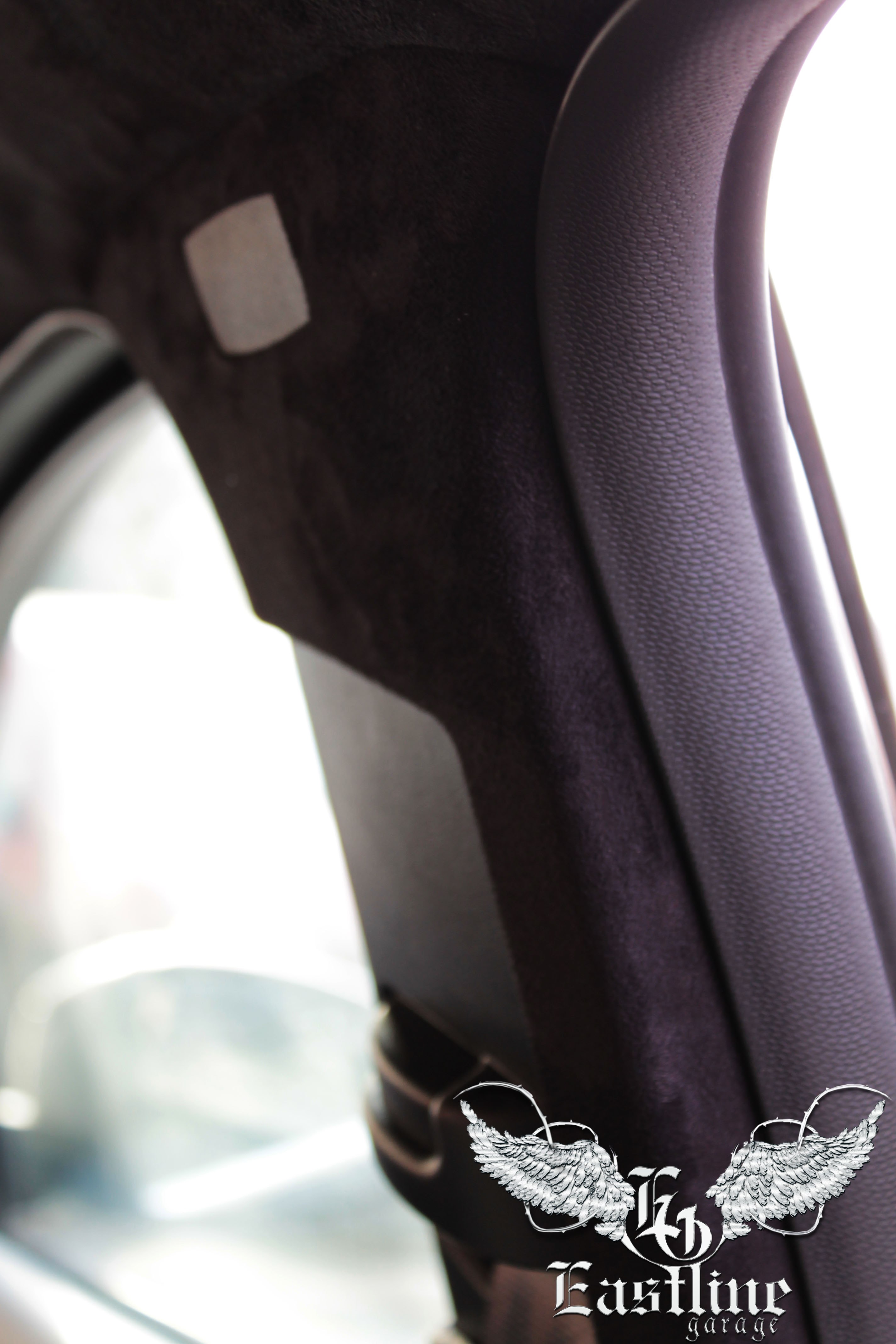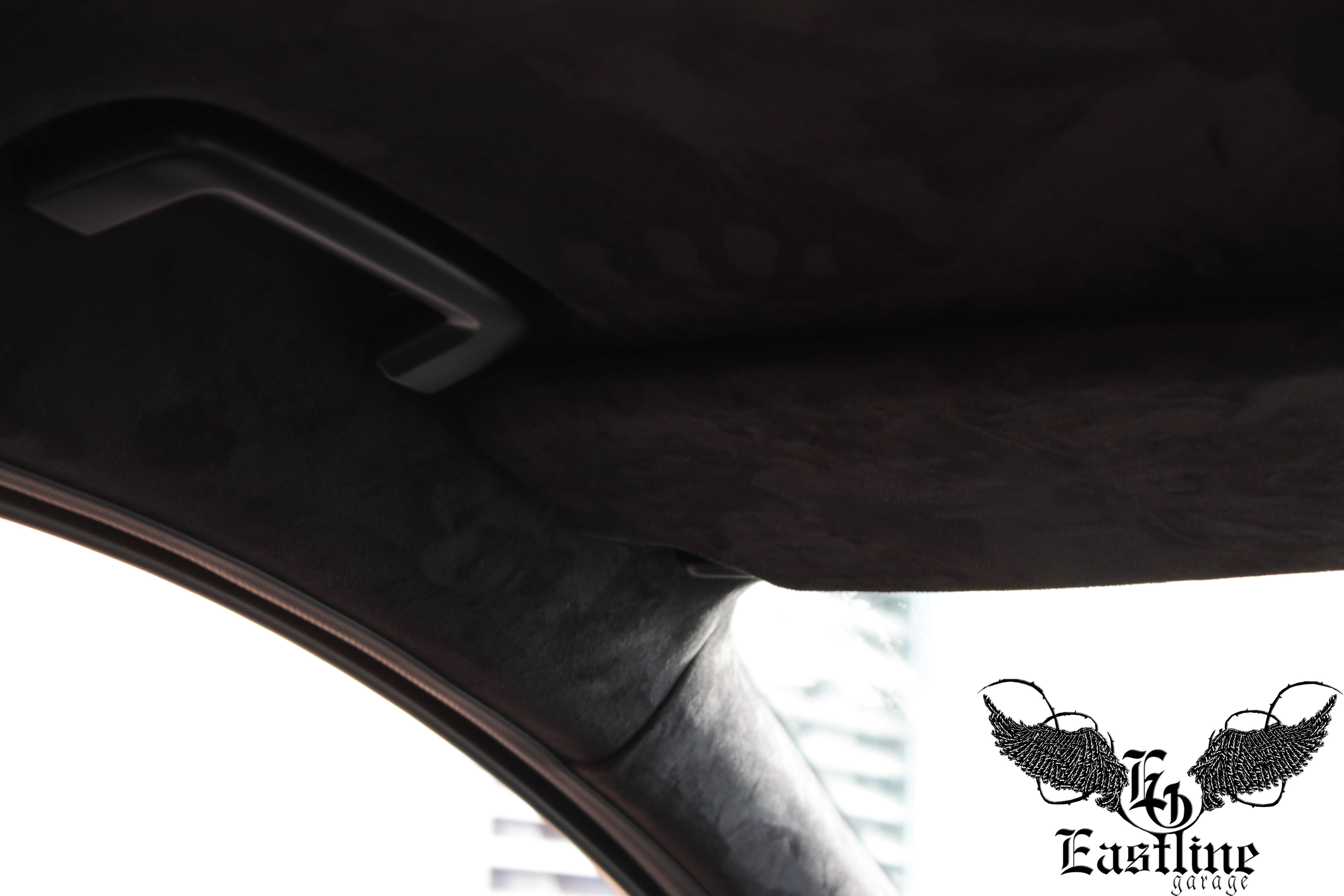 В качестве материала для перетяжки потолка, автовладельцем была выбрана, так называемая, самоклеющаяся алькантара. Это синтетический материал, сделанный по подобию итальянской (оригинальной) алькантары, которая в свою очередь по внешнему виду и тактильным ощущениям напоминает замшу. Аналог алькантары, которым перетягивали потолок в данном автомобиле, имеет самоклеющуюся основу. Цвет самоклейки – черный, полностью гармонирует с остальным салоном автомобиля.