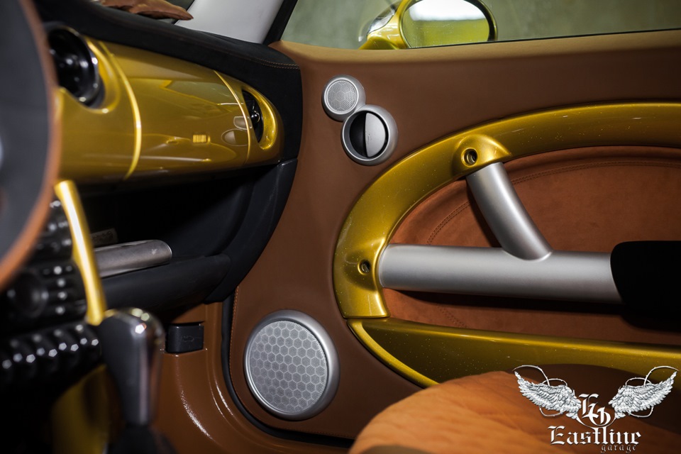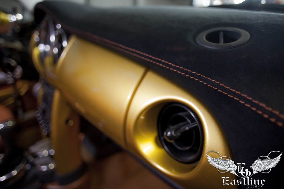 Когда кузов был покрашен, из него действительно получился «слиток золота». Мы сделали полную шумоизоляцию, чтобы уже никакие посторонние звуки не помешали получать удовольствие от поездки. Мы покрасили пластик в салоне автомобиля. Частично в золотой цвет, а частично в тон кожи сидений.