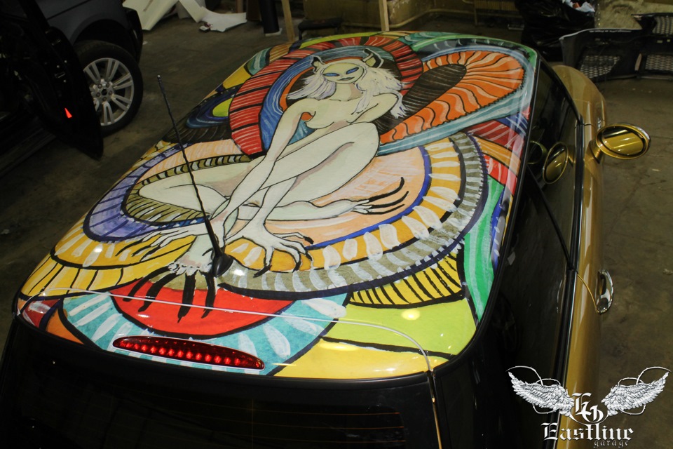 В качестве подарка клиентам была выполнена винилография на крыше. Рисунок выбирал сам заказчик. А для прекрасной хозяйки авто наш мастер сшил брелок для ключей в форме мишки, маленькое дополнение к образу этого автомобиля.