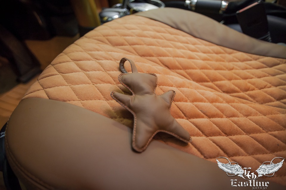 Сначала мы целиком разобрали авто. Кузов отправили на покраску, а швейный цех принялся за свою нелегкую работу. Так как заказчик хотел сделать золотой слиток, то и цвета для салона мы подбирали соответствующие. Для сидений выбрали гладкую кожу Nappa и подобрали итальянскую алькантару в тон. Сперва произвели «операцию» по изменению кроя сидений, которая в последнее время стала довольно популярной и востребованной. Она дает возможность перешить ваши сидения именно под личное пожелание ,также можно изменять анатомию самих сидений, ведь автомобиль для ежедневных поездок на работу и с работы хочется сделать максимально удобным. Центральные части из алькантары прострочили ромбиком, как на передних, так и на задних сидениях. А заднюю часть передних сидений оформили из корейской алькантары с самоклеющейся основой.