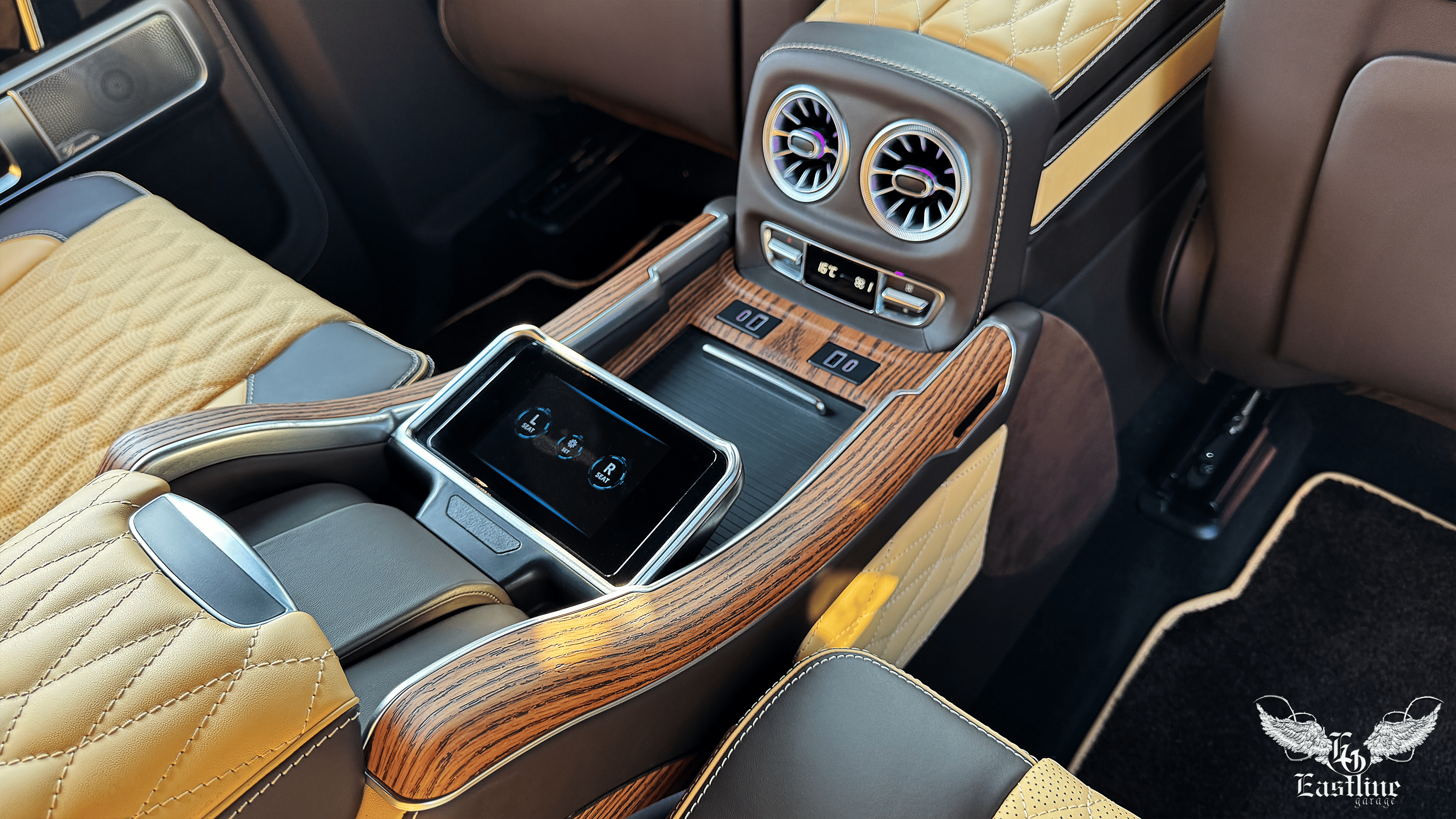 Но, друзья, мало было сделать роскошный цвет салона, нужно было добавить ему настоящего комфорта. Поэтому мы установили сюда потрясающе комфортный задний модуль от Eastline Garage с центральной консолью и двумя раздельными сиденьями, у каждого из которых есть массаж, вентиляция и обогрев.