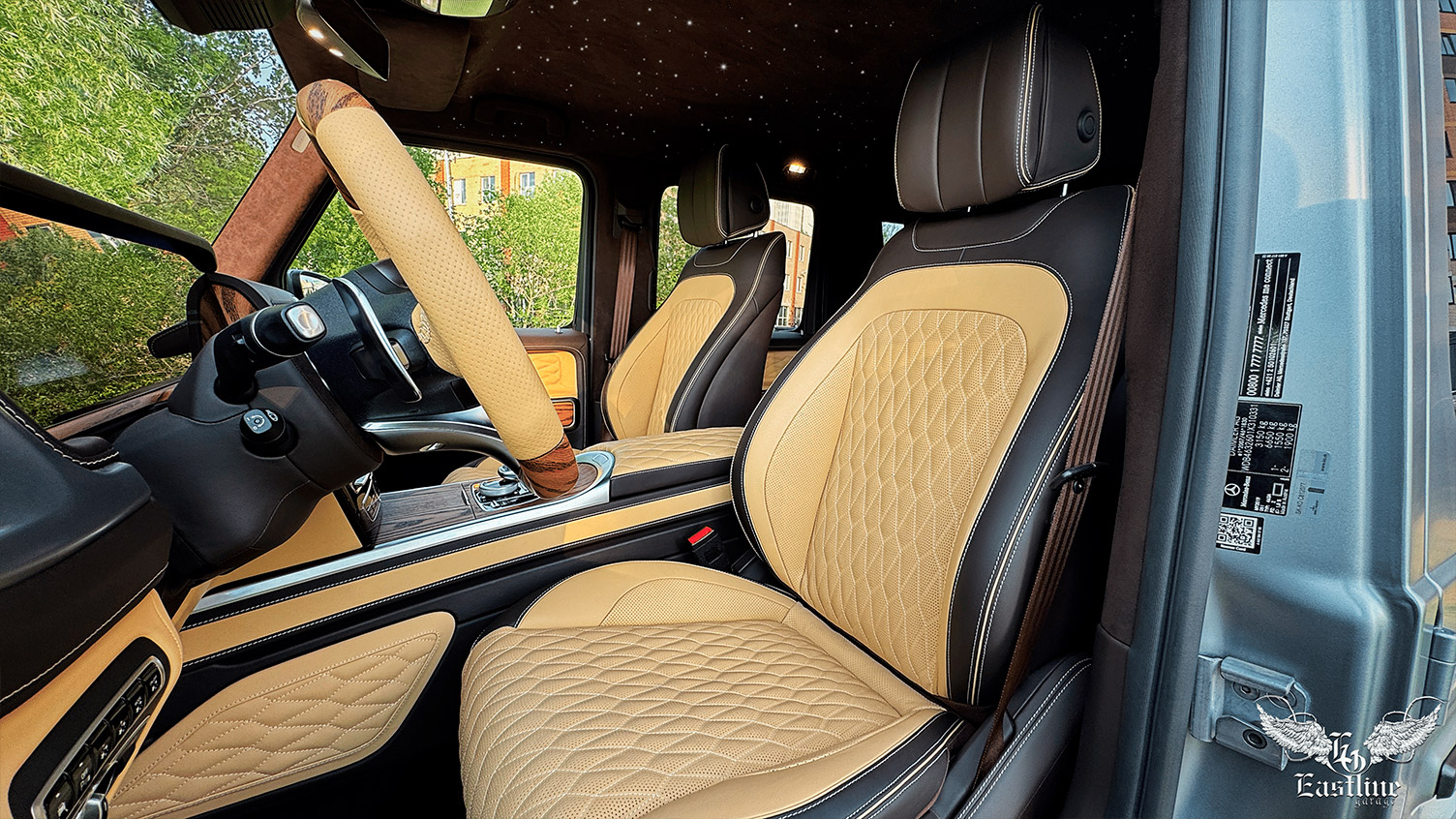Перед Вами Mercedes-Benz G-класс (бензиновая версия) нашего постоянного клиента, которому два года назад мы пошили шикарный салон в цвете Espresso Brown с коричневым потолком из алькантары и звездным небом и переодели его в AMG.