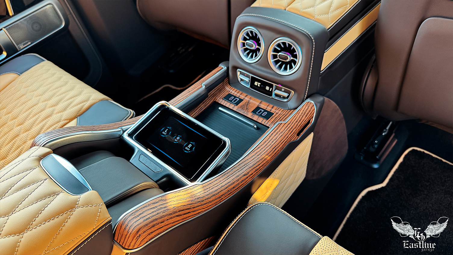Но, друзья, мало было сделать роскошный цвет салона, нужно было добавить ему настоящего комфорта. Поэтому мы установили сюда потрясающе комфортный задний модуль от Eastline Garage с центральной консолью и двумя раздельными сиденьями, у каждого из которых есть массаж, вентиляция и обогрев.
