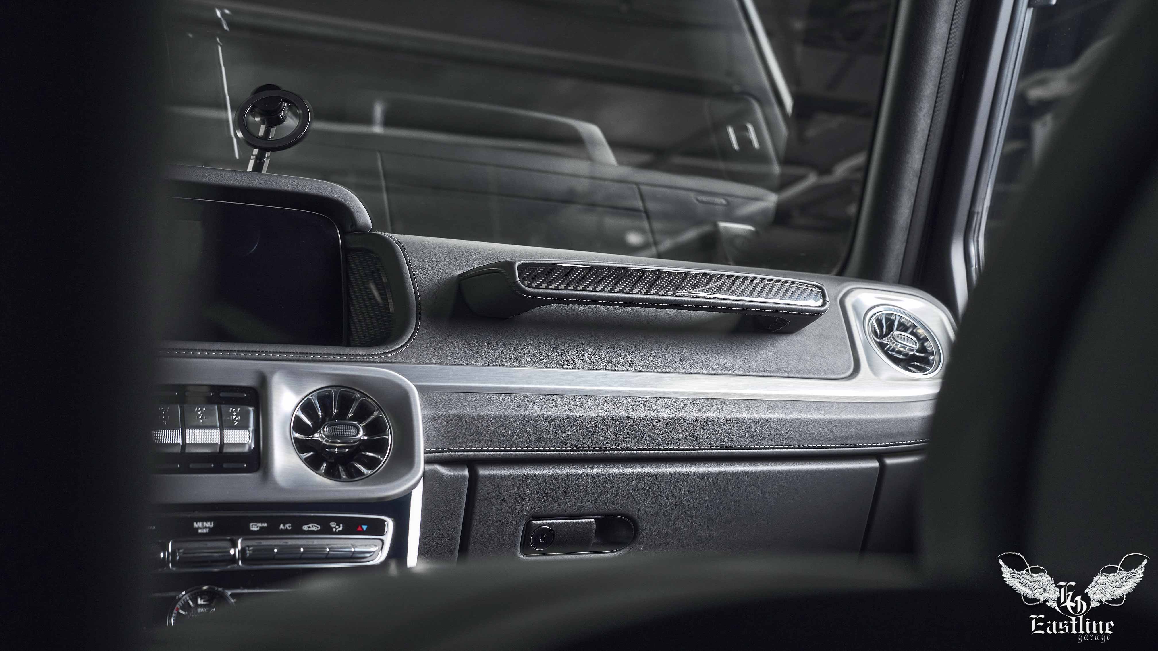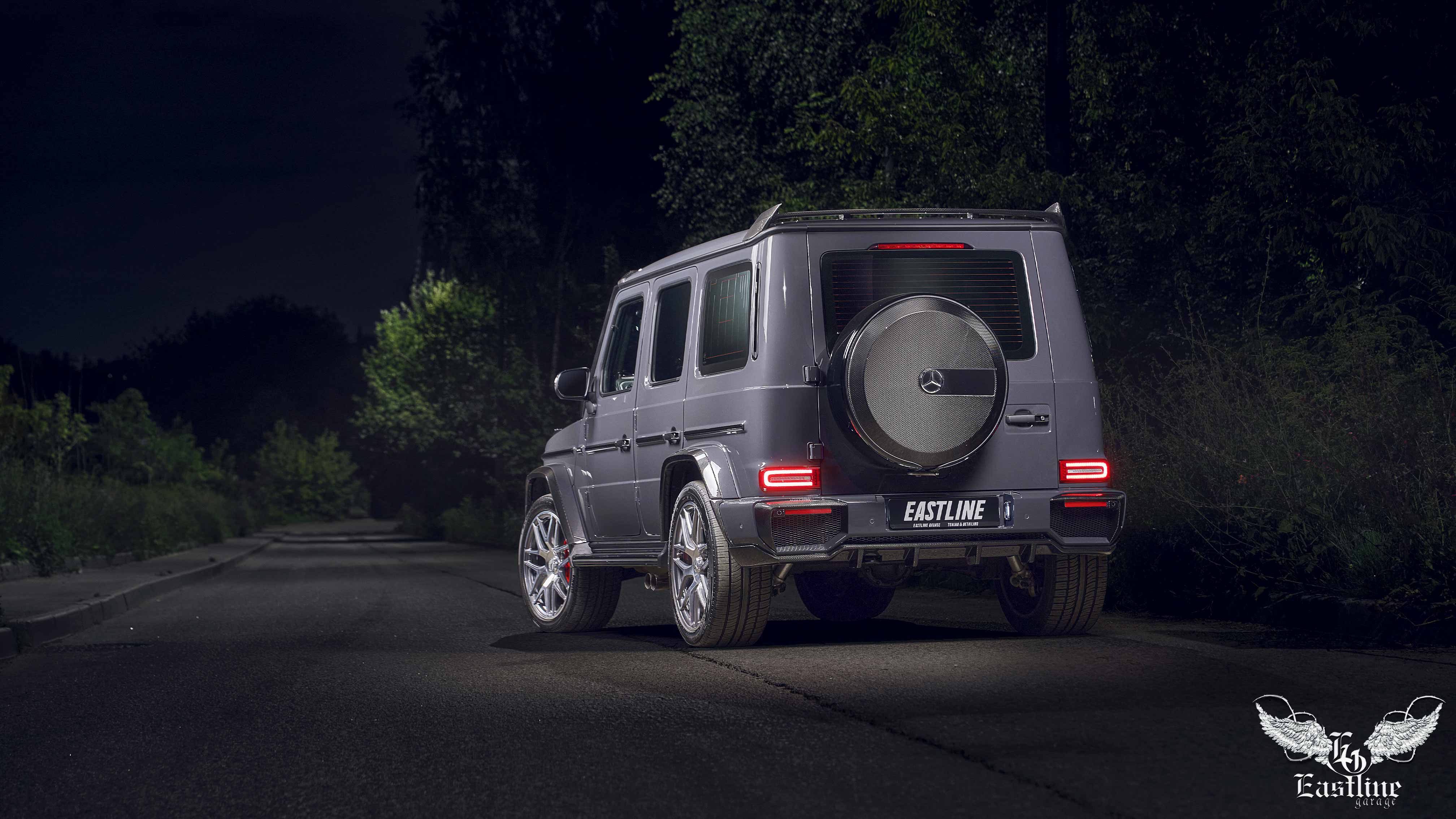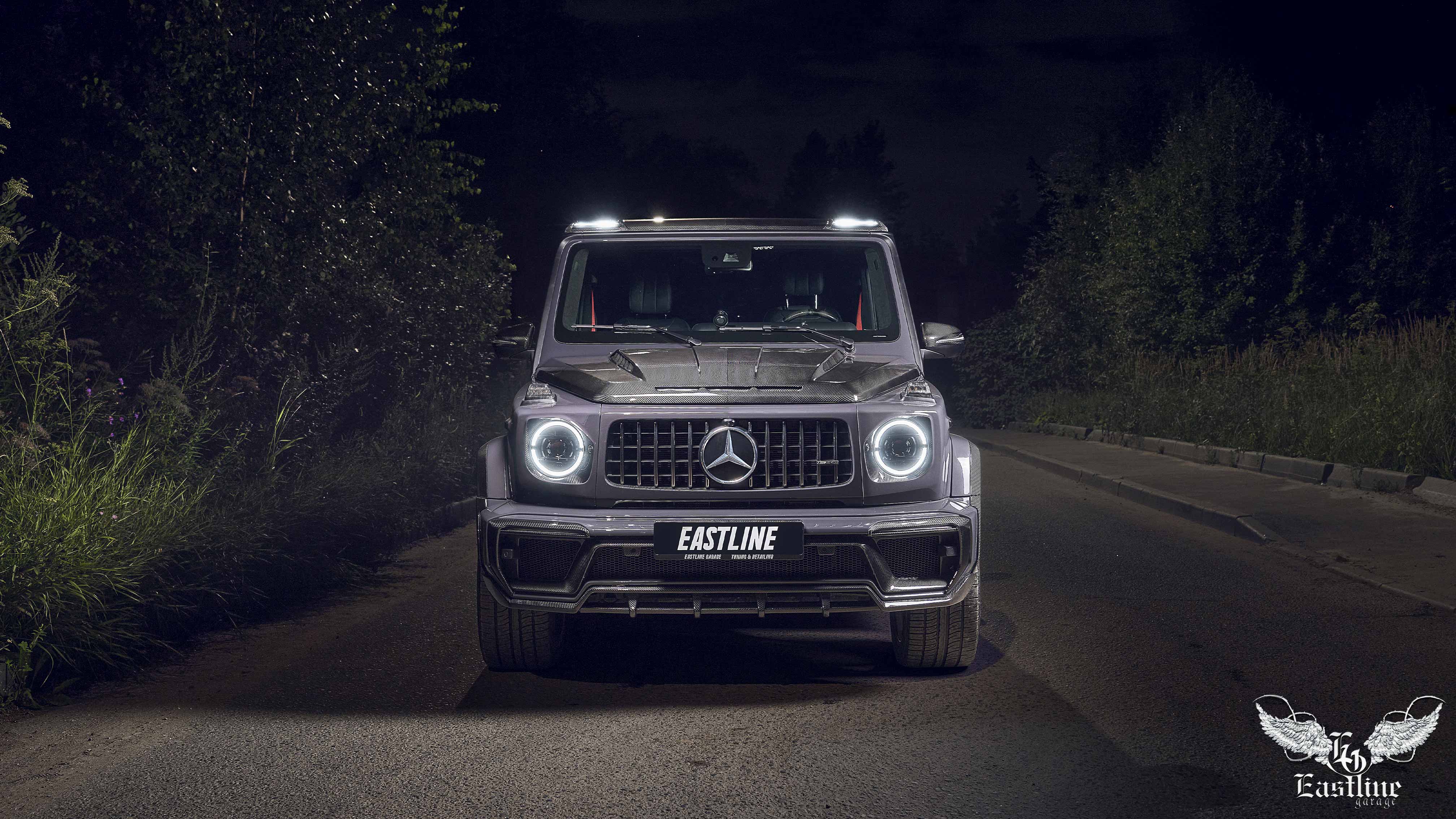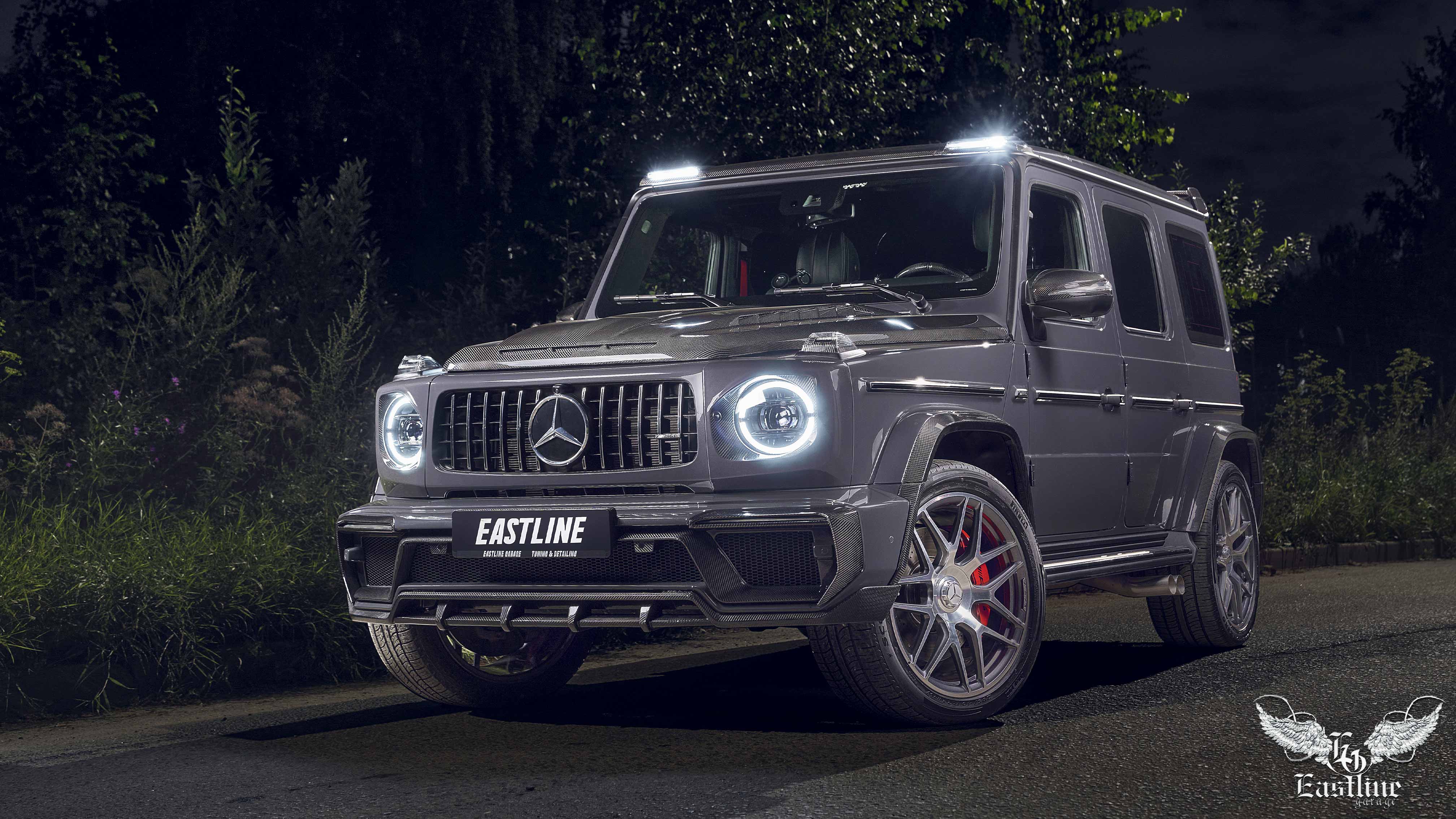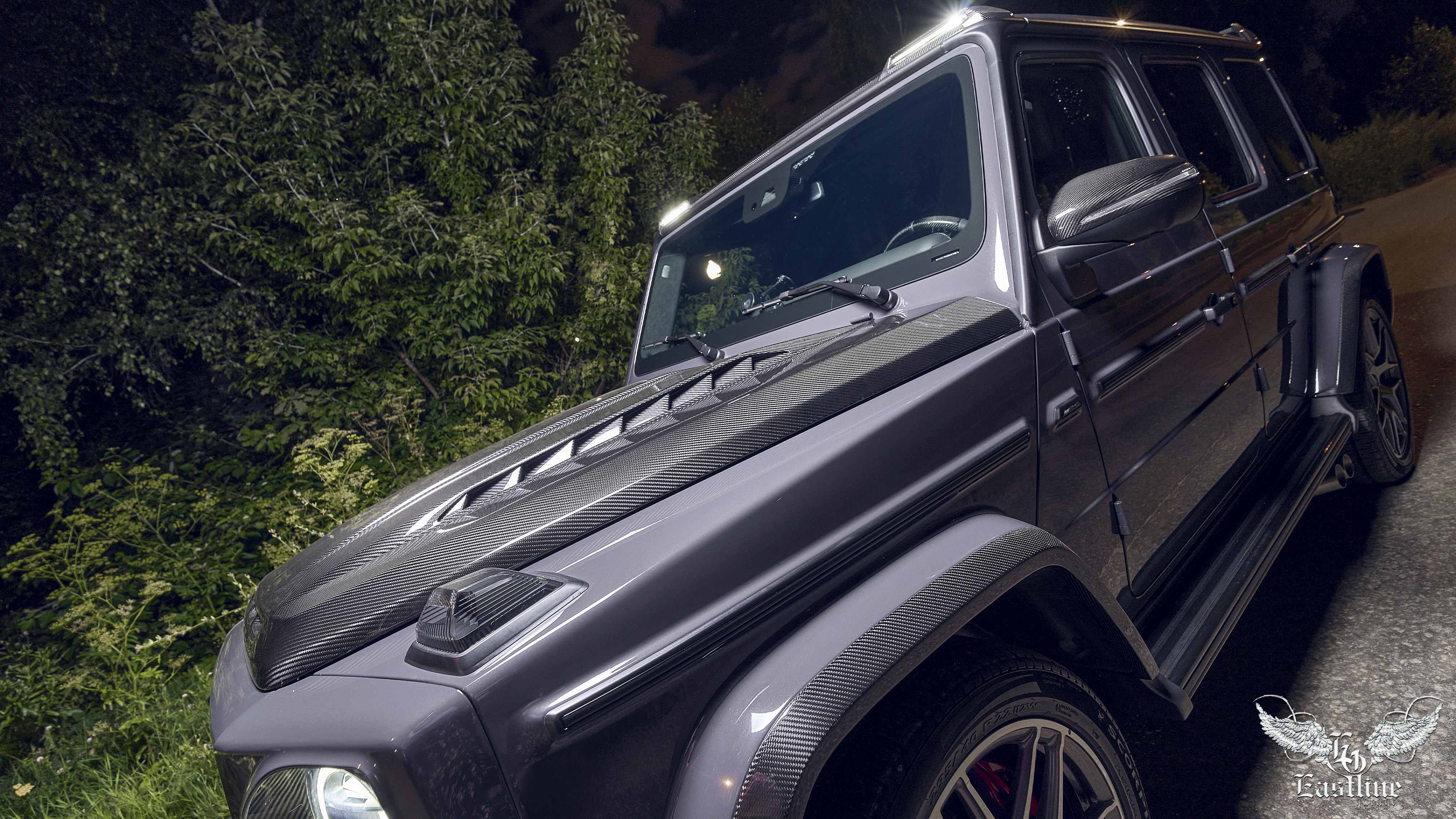 Как сделать яркую внешность G63 еще более броской и брутальной? Установить обвес в стиле TopCar от тюнинг-ательеEastline Garage! Точнее, это самый настоящий боди-кит, ведь в наш комплект входит карбоновый капот, карбоновые надфарники, передний бампер с карбоновой губой и карбоновыми накладками ДХО, задний бампер с карбоновыми элементами и карбоновые расширители арок.