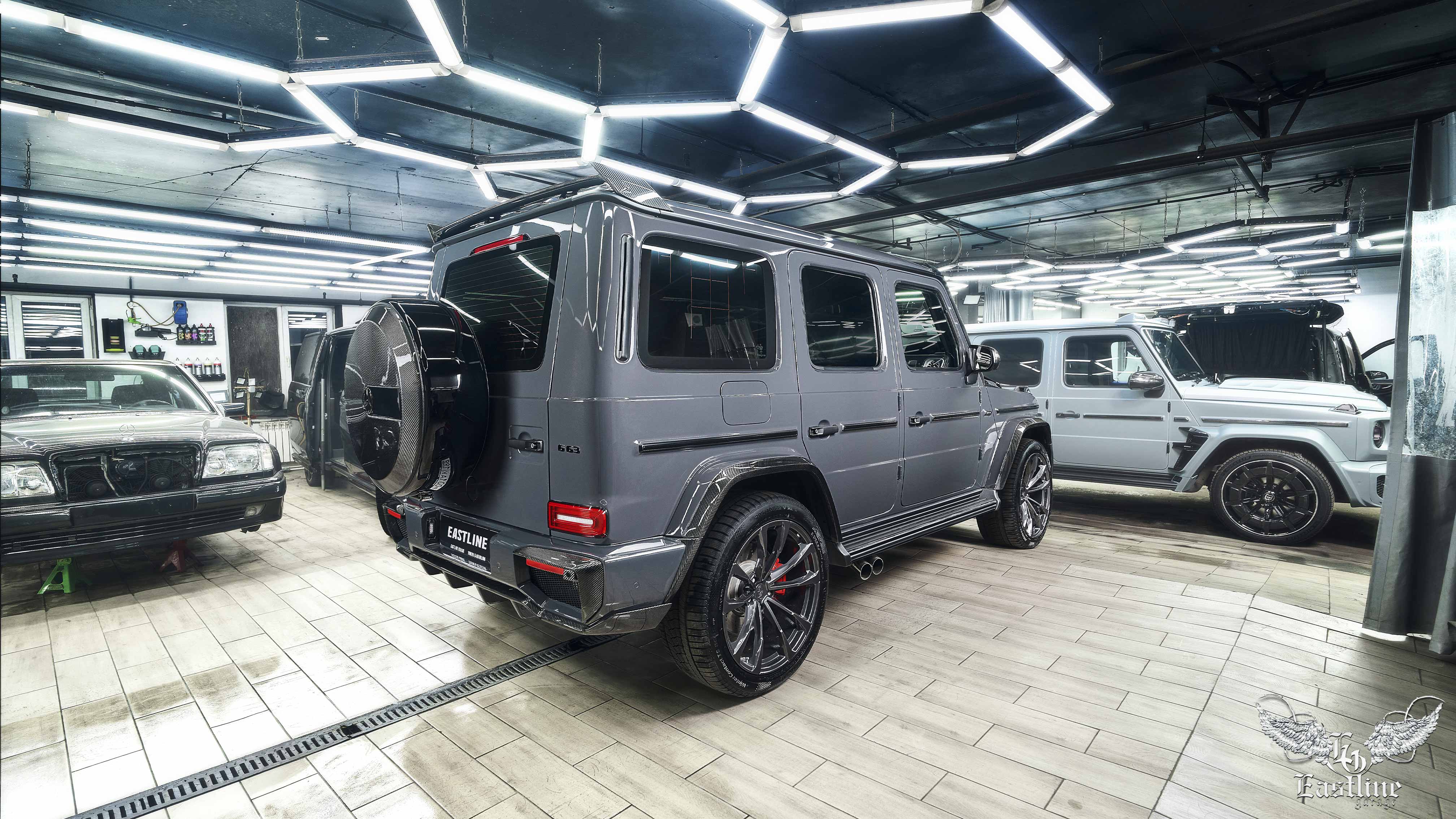 Изначально зеленый кузов этого G63 оклеили в полиуретан темно-серого цвета: чтобы освежить облик автомобиля, защитить ЛКП и получить идеальное цветовое сочетание с новым обвесом. Оклейка пленкой, естественно, выполнена тщательно, со всеми проемами, и создается впечатление, что Гелендваген был полностью перекрашен.